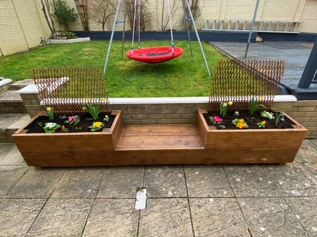 (such as rejuvenated scaffold boards used to make flower beds with seating).